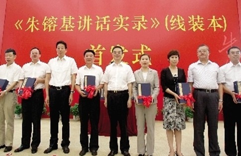 國家圖書館、中國第一歷史檔案館、清華大學(xué)圖書館、湖南圖書館、長沙縣、長沙市一中等單位在首發(fā)式上獲贈《朱镕基講話實錄》(線裝本)。