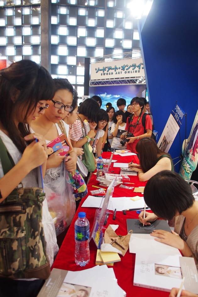 相比三年前首次亮相中國國際動漫游戲博覽會,向讀者們推出的僅是輕小說圖書,發(fā)展至今的天聞角川已經實現(xiàn)了系列書籍的規(guī)?;⒆髌奉愋团c題材的多樣化。除引進優(yōu)秀作品外,天聞角川還致力于在原創(chuàng)輕小說、漫畫、繪本、畫集、雜志等方面不斷推出精品暢銷書,如Buddy創(chuàng)作的漫畫《初·末ONCE AGAIN》、昔酒011創(chuàng)作的繪本《好心的沙子》、呀呀創(chuàng)作的畫集《花·女詞》等,都是優(yōu)秀的原創(chuàng)作品,均將在本場展會亮相。天聞角川在一百多平米的展位里,以精心的布置和擺放,向讀者展示了近800種的圖書。專門針對本場展會特別首發(fā)的人氣圖書《刀劍神域11》和《KEI畫集 mikucolor》,以及今年首度推出的“輕文學”“天驕書坊”新書系,在開展第一天就被讀者一搶而空,工作人員又緊急安排補貨。天聞角川向大家呈現(xiàn)動漫圖書的王國,讓讀者盛夏暢游書海,快樂充實!