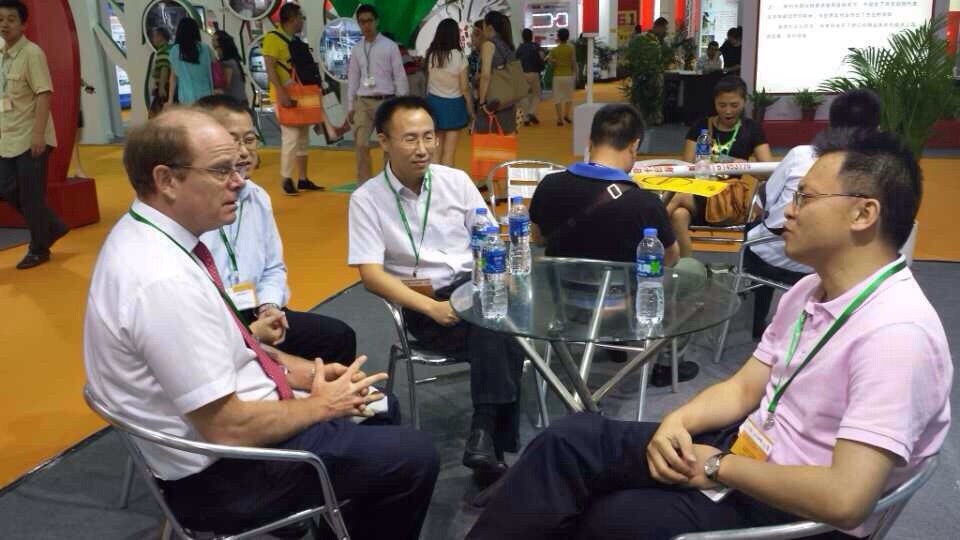 中南傳媒副總經(jīng)理,湖南天聞?dòng)?wù)公司董事長(zhǎng)潘曉山(右一),與展廳現(xiàn)場(chǎng)客戶會(huì)談