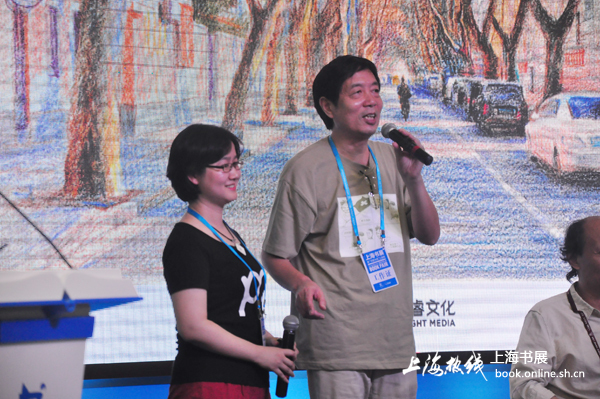 畫家黃石(右)為讀者介紹《最美的上?!肪庉?/font>