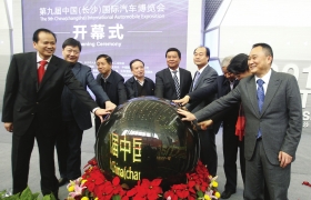 第九屆中國(長沙)國際汽車博覽會(huì)開幕,湖南省副省長何報(bào)翔(左五)等領(lǐng)導(dǎo)共同啟動(dòng)象征車展開幕的水晶球。