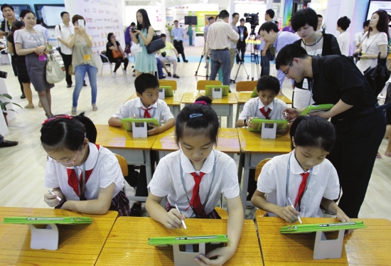 在演示上課的過程中,“老師”手執(zhí)平板電腦,“學(xué)生”的課桌上也每人有一臺(tái)平板電腦。“老師”播放的拔河比賽動(dòng)畫,“學(xué)生”在自己的平板電腦上可以同步看到,并在電腦上完成習(xí)題。電腦系統(tǒng)后臺(tái)可以實(shí)現(xiàn)對每位學(xué)生所做客觀題的對錯(cuò)進(jìn)行判分,并反饋到“老師”手中的電腦上,老師據(jù)此掌握到了每個(gè)學(xué)生課堂學(xué)習(xí)情況,并可以進(jìn)行重點(diǎn)教學(xué)和分層次教育。