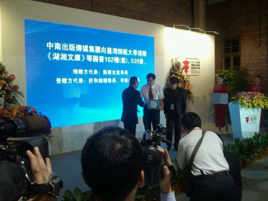 9月18日,“2013湖南兩岸文化創(chuàng)意產(chǎn)業(yè)合作周”在臺北華山文創(chuàng)園區(qū)開幕。在開幕式上,中南傳媒董事長龔曙光作為捐贈代表向臺灣師范大學捐贈了包括《湖湘文庫》在內(nèi)的102種湘版圖書,共計539冊,此次捐贈有利于加深臺灣大學生及民眾對湖湘文化的了解和學習。