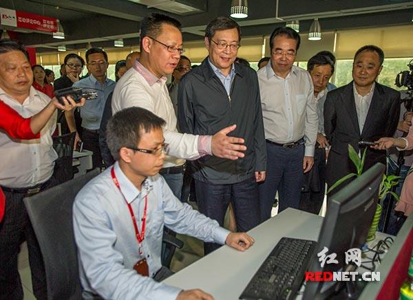 (湖南省委副書(shū)記、省長(zhǎng)杜家毫[右四]在仔細(xì)了解紅網(wǎng)的精品創(chuàng)意欄目的生產(chǎn)情況。)