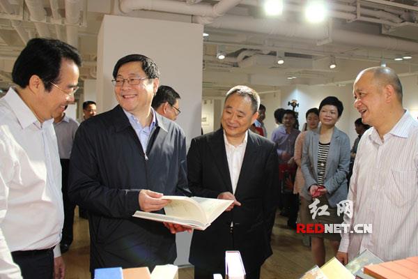 (湖南省委副書(shū)記、省長(zhǎng)杜家毫[左二]在湖南美術(shù)出版社視察,了解中南傳媒圖書(shū)出版發(fā)行情況。)