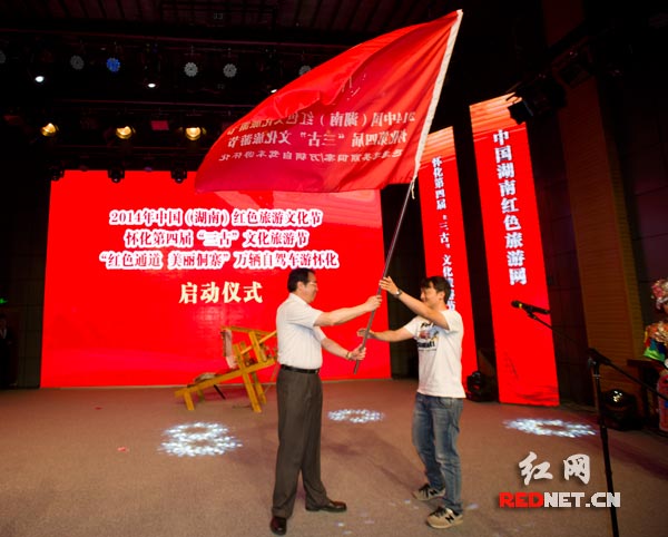 湖南省委常委、省委宣傳部部長(zhǎng)許又聲[左]為“紅色通道 美麗侗寨”萬(wàn)輛自駕車游懷化活動(dòng)授旗。