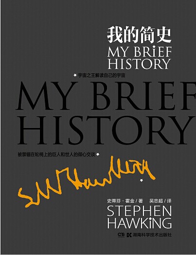 2014年7月25日,在湖南科學技術出版社“首席編輯薦書”活動中,史蒂芬·霍金新作《我的簡史》上市發(fā)布。與之前的《霍金傳》、《飛向無限》這兩本由別人撰寫的傳記不同,這是第一本由霍金親自著述的自傳。該書定價42元,由中南出版?zhèn)髅郊瘓F旗下湖南科學技術出版社出版發(fā)行,首印達到了50000冊,將通過全國的新華書店、網(wǎng)上書店等渠道公開發(fā)行。其特別設計的霍金親筆簽名的鏤空封面和精裝效果,使本書兼具很好的閱讀價值和收藏價值。