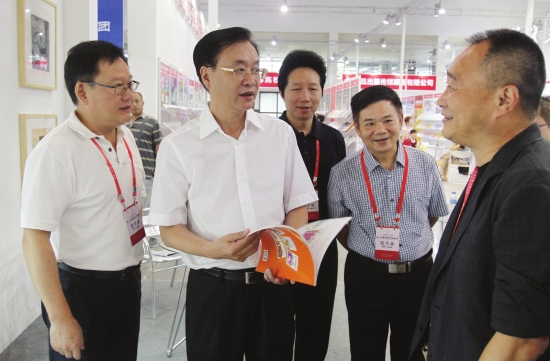 8月1日,貴州省貴陽市,湖南省副省長李友志(左二)在湖南省新聞出版廣電局黨組書記、局長朱建綱(左一),湖南代表團(tuán)團(tuán)長朱三平(右二),湖南出版投資控股集團(tuán)黨委書記、董事長,中南傳媒董事長龔曙光(右一),中南傳媒副總經(jīng)理劉清華(左三)的陪同下巡視第24屆書博會湖南展館。