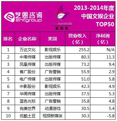 近日,由藝恩主辦的“紫勛之夜”頒獎盛典在京開幕。頒獎典禮現(xiàn)場發(fā)布了2013-2014年度中國文娛企業(yè)50強(qiáng)榜單。