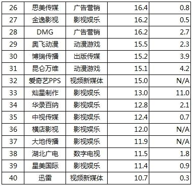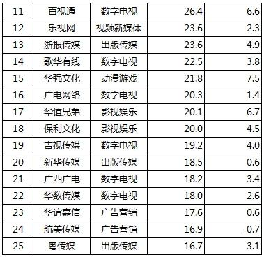 本次評選出的50強(qiáng)企業(yè)涵蓋影視娛樂、出版?zhèn)髅?、視頻新媒體、廣告營銷、動漫游戲和數(shù)字電視六大類別,中南傳媒位居總榜第二位、出版?zhèn)髅郊?xì)分領(lǐng)域第一位。在其他細(xì)分領(lǐng)域,萬達(dá)文化、省廣股份、完美世界、優(yōu)酷土豆、百視通分別位居影視娛樂、視頻新媒體、廣告營銷、動漫游戲和數(shù)字電視細(xì)分領(lǐng)域榜首。