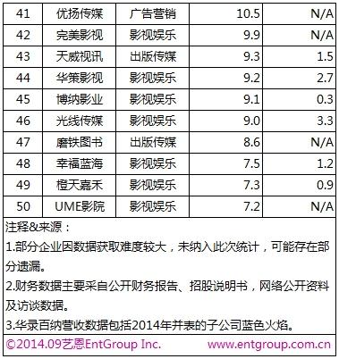本次評(píng)選出的50強(qiáng)企業(yè)涵蓋影視娛樂(lè)、出版?zhèn)髅健⒁曨l新媒體、廣告營(yíng)銷(xiāo)、動(dòng)漫游戲和數(shù)字電視六大類(lèi)別,中南傳媒位居總榜第二位、出版?zhèn)髅郊?xì)分領(lǐng)域第一位。在其他細(xì)分領(lǐng)域,萬(wàn)達(dá)文化、省廣股份、完美世界、優(yōu)酷土豆、百視通分別位居影視娛樂(lè)、視頻新媒體、廣告營(yíng)銷(xiāo)、動(dòng)漫游戲和數(shù)字電視細(xì)分領(lǐng)域榜首。