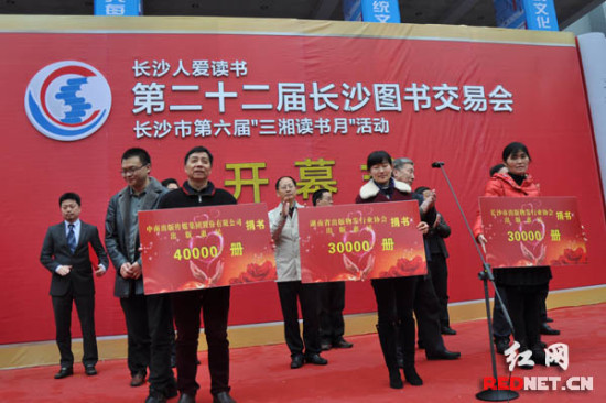 開(kāi)幕儀式上,中南傳媒集團(tuán)股份有限公司、湖南省出版物發(fā)行業(yè)協(xié)會(huì)、長(zhǎng)沙市出版物發(fā)行業(yè)協(xié)會(huì)向長(zhǎng)沙市圖書(shū)館總分館、14家首批示范性農(nóng)家書(shū)屋和獲得全國(guó)“書(shū)香之家”稱(chēng)號(hào)的書(shū)香家庭,捐贈(zèng)了10萬(wàn)冊(cè)圖書(shū)。2014年度長(zhǎng)沙人最喜愛(ài)的10本書(shū)也同時(shí)揭曉,其中,《習(xí)近平談治國(guó)理政》、王躍文所著的《愛(ài)歷元年》等書(shū)成功入選。